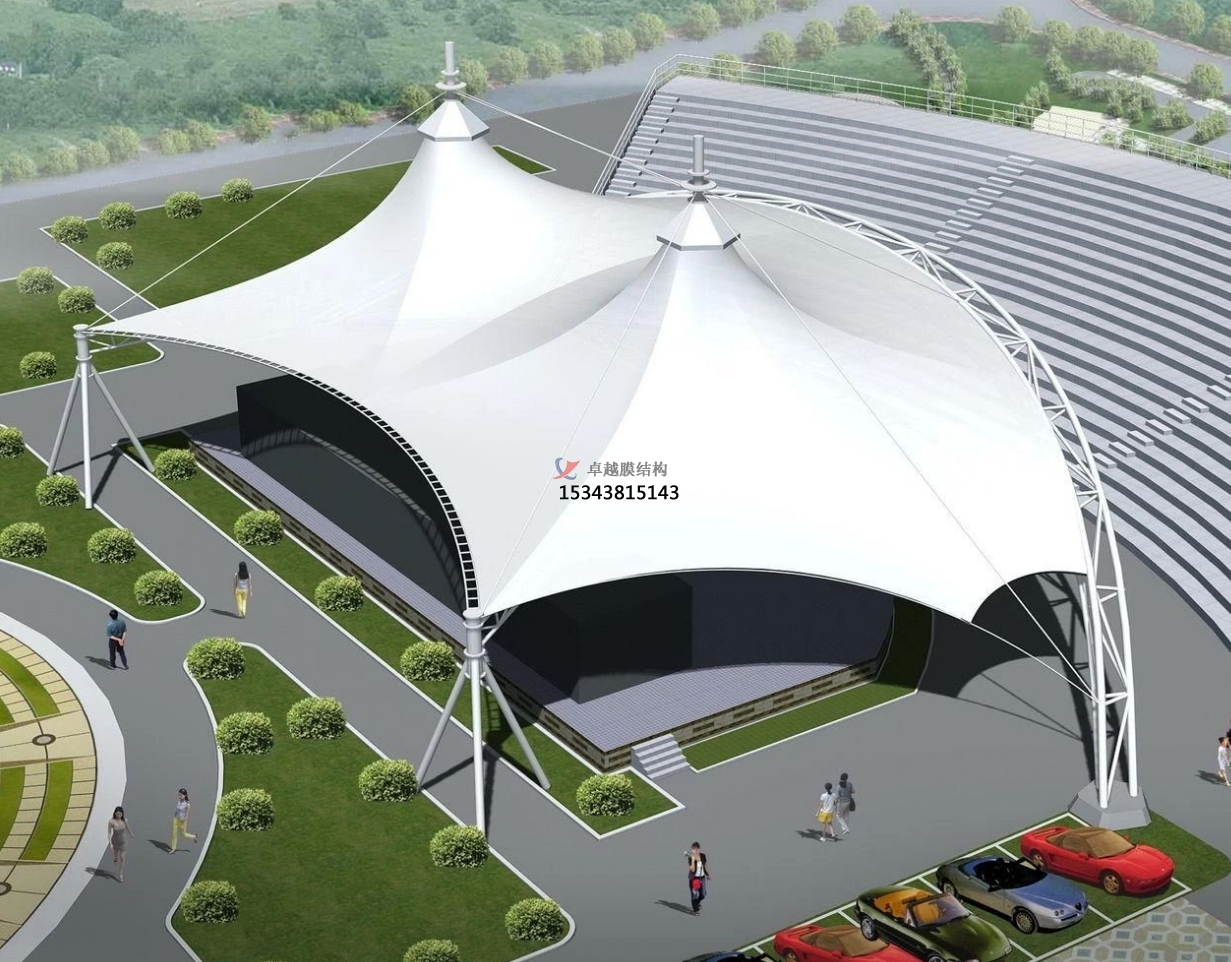 舞臺膜結構遮陽棚廣泛應用于各種戶外演出和活動中,如音樂會、戲劇表演、舞蹈演出等。此外,它還可以作為臨時展覽、會議等活動的遮陽設施。隨著戶外活動和露天演出的增多,舞臺膜結構遮陽棚的實用性也越發(fā)凸顯。