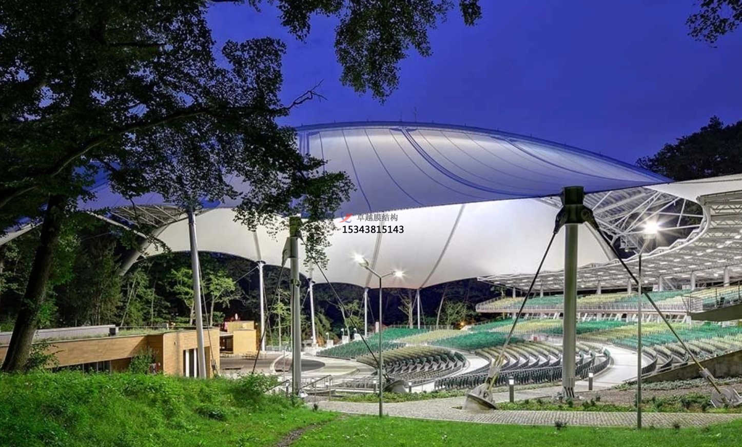 舞臺膜結構遮陽棚的膜材料具有一定的透光性,可以根據(jù)演出需要調(diào)節(jié)光線的明暗和色彩。在白天,自然光透過膜材料灑落在舞臺上,為演出增添了一份自然和溫馨;在夜晚,舞臺燈光與膜材料的透光性相結合,可以營造出夢幻般的舞臺效果。