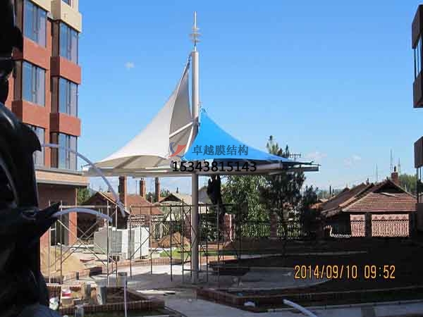 一個(gè)城市的中心區(qū)反映一個(gè)城市的地理風(fēng)貌和民族風(fēng)情,同時(shí),也是一個(gè)城市文化發(fā)展程度的標(biāo)志。而景觀設(shè)計(jì)要求其具有廣泛的可讀性、雅俗共賞,既有超凡脫俗的藝術(shù)價(jià)值,又能使大眾喜聞樂(lè)見與大眾息息相通。膜結(jié)構(gòu)以其輕盈飄逸的造型、柔美并帶有力量的曲線和大跨度和大空間的鮮明個(gè)性和標(biāo)識(shí)性,應(yīng)用于城市小品設(shè)計(jì)中。