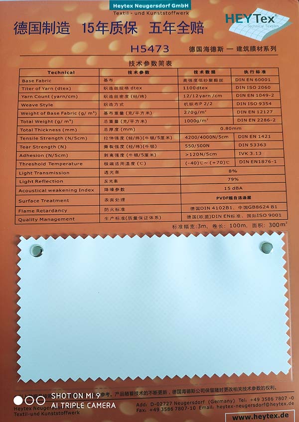 II. HeytexH5573建筑膜材為新一代可焊式PVDF復合材料,雙面PVDF涂層,直接焊接,10年質(zhì)保。