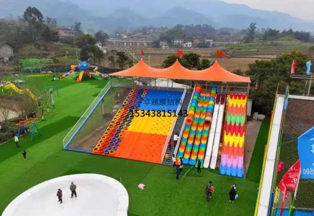 色彩鮮艷:張拉膜結(jié)構(gòu)采用高強(qiáng)度材料制成,表面涂有彩色涂層,可以呈現(xiàn)出絢麗多彩的效果,為游客帶來更加豐富的游玩體驗(yàn)。